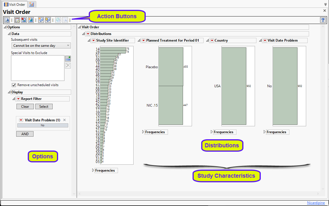 Running Visit Order with the Nicardipine sample setting and default options generates the report shown below: