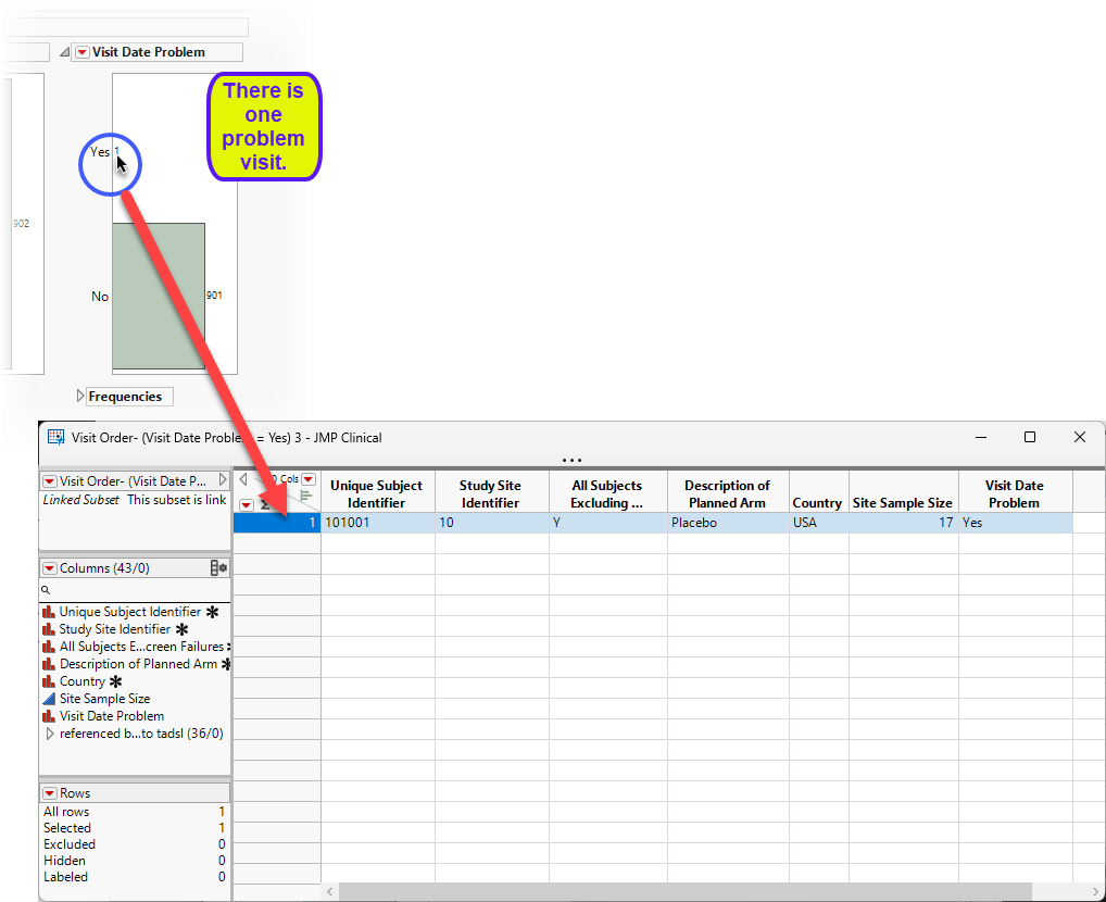 | 8 | Double-click on the Yes column to open a table listing the USUBJID, study site(s) and other information about the subject(s) with the problem visit dates. |