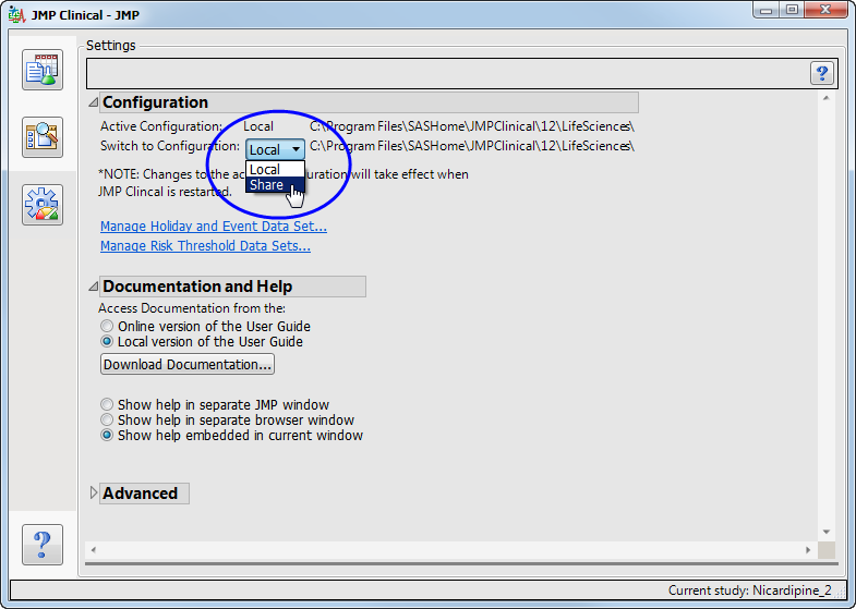To set up a shared location for your studies, you must first map a location on a shared drive and then modify the installation.configuration.preferences file that is installed with JMP Clinical.