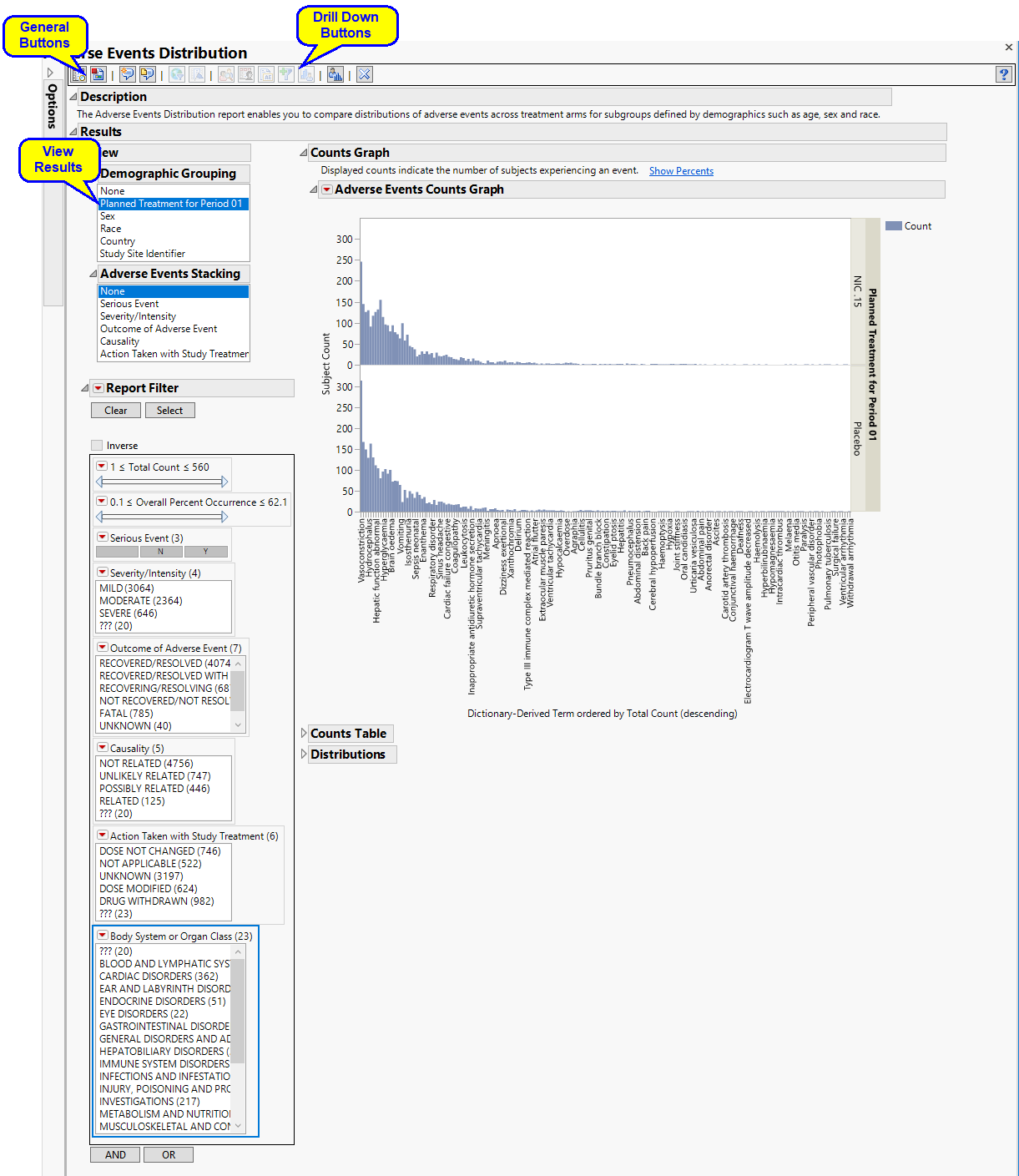 | • | : Panel enables analysis of various demographic groups by selected adverse events. |