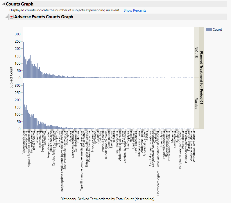 Running Adverse Events Distribution with Nicardipine using Actual for Treatment or Comparison Variable to Use generates the Report for Adverse Events Distribution as shown below. Differences with other reports are noted throughout this output description.