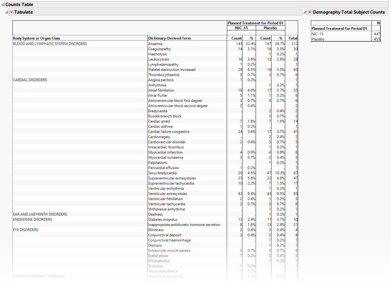 | • | One Table detailing the counts for each treatment group, for each dictionary-derived term within each body system or organ class. |