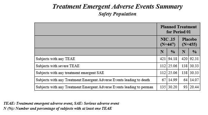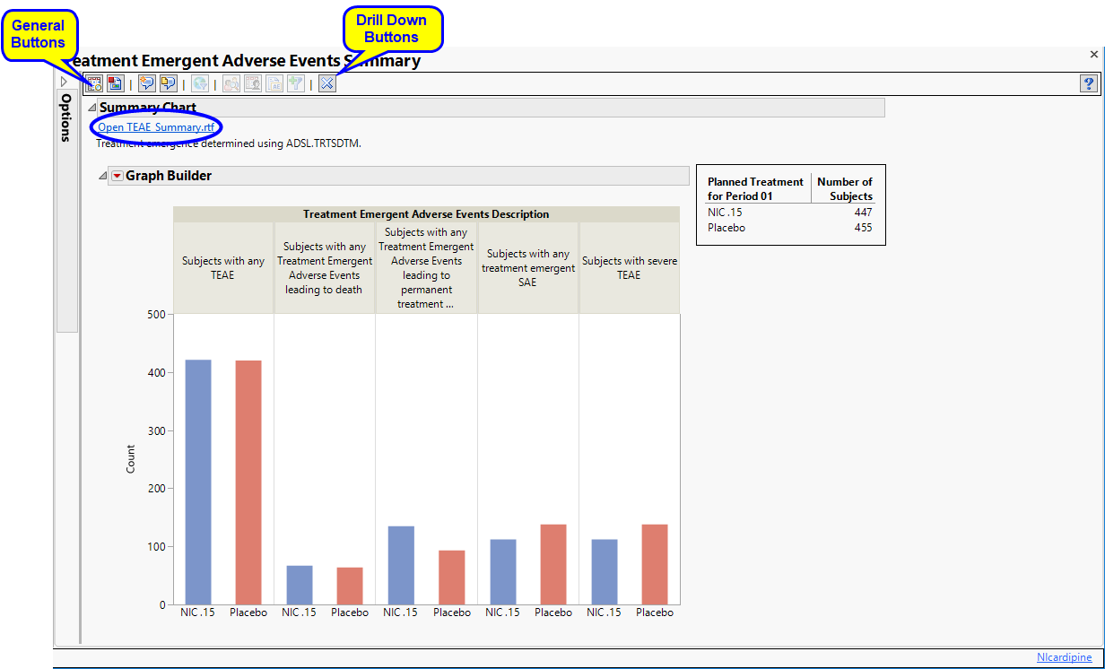 Running Treatment Emergent Adverse Events Summary for Nicardipine using default settings generates the Report shown below.