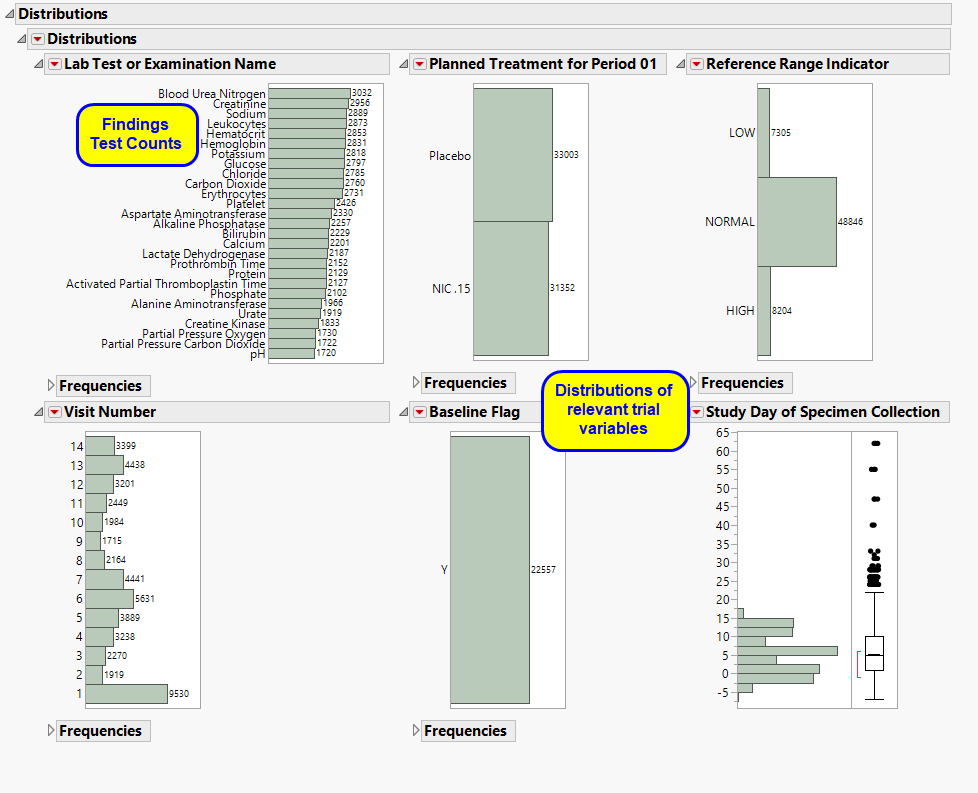 These display counts and histograms of relevant variables in the Findings data set. A distribution of subjects on the Actual, Planned, or Specified Treatment is shown as well as other findings variables (if present). Findings variables displayed can include the Findings Body System (xxBODSYS), Reference Range Indicator1 (xxNRIND), the Category for the Test (xxCAT) and Subcategory (xxSCAT), the Categorical Findings Result (xxSTRESC, only displayed for categorical findings domains), the Visit and Time Points at which findings were taken (VISIT and xxTPT), Baseline Flag (xxBLFL), and the Study Day.