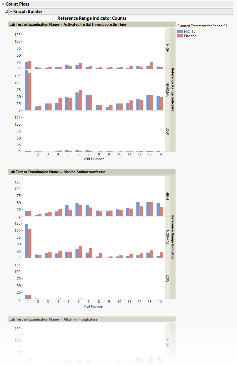 These plots show the distribution of measurements across categories of the Reference Range Indicator variable (xxNRIND). For example, you can see how many laboratory measurements for a given test were categorized as HIGH, NORMAL, or LOW based on values of the Reference Range Upper Limit and Reference Range Lower Limit (LBSTNRLO and LBSTNRHI, respectively). The graph contains bars representing the counts within each category for each treatment across Study Visits (VISIT or VISITNUM).