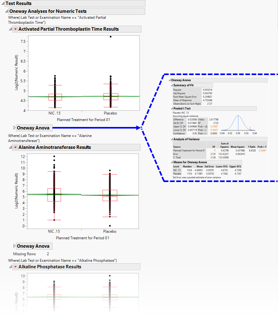 Each analysis represents an Analysis of Variance (ANOVA) for each numeric Findings test (tests that contain nonmissing values for xxSTRESN) to compare measurements taken across different treatment arms. You can click the Oneway ANOVA outline box below each plot to show the statistical results of the analysis.