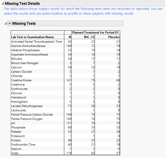 Note: This section is not shown if all subjects have nonmissing measurements taken for all Findings tests recorded.