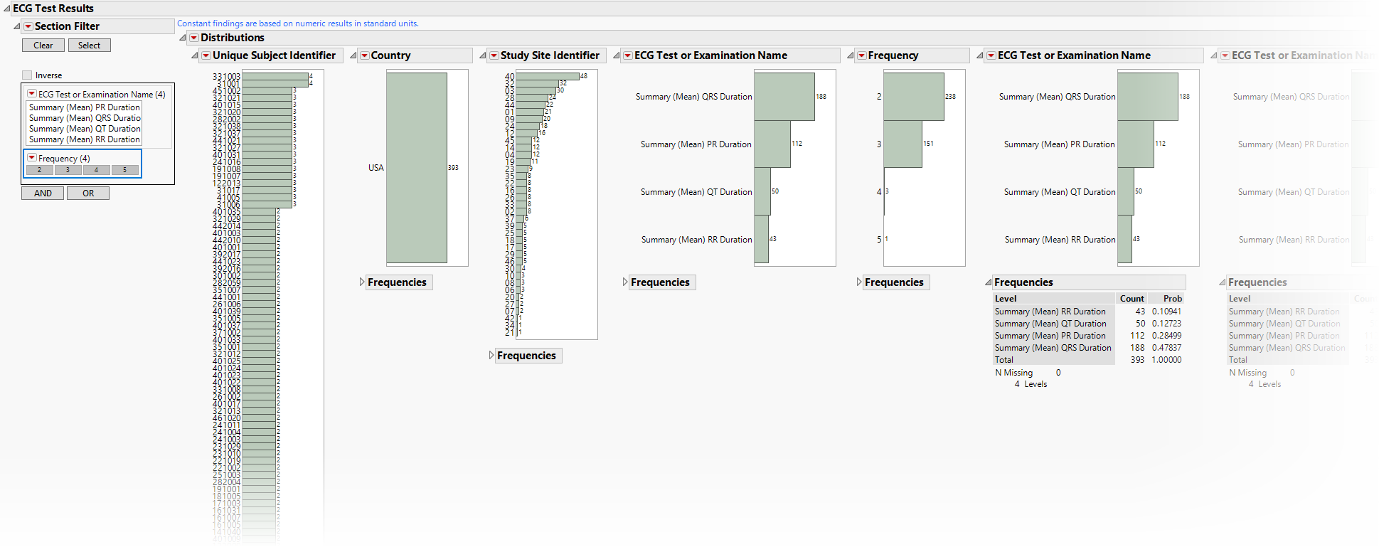 The data table underlying these histograms represent tests that are constant for the duration of the trial. Therefore, Unique Subject Identifier summarizes the number of ECG tests that are constant for each subject. Country summarizes the country of the study site subjects participated at. Study Site Identifier shows the frequency of constant tests at each study site. Test or Examination Name shows the tests that are constant. Treatment Arm is provided to show whether the frequency of constant tests varies based on study treatment.