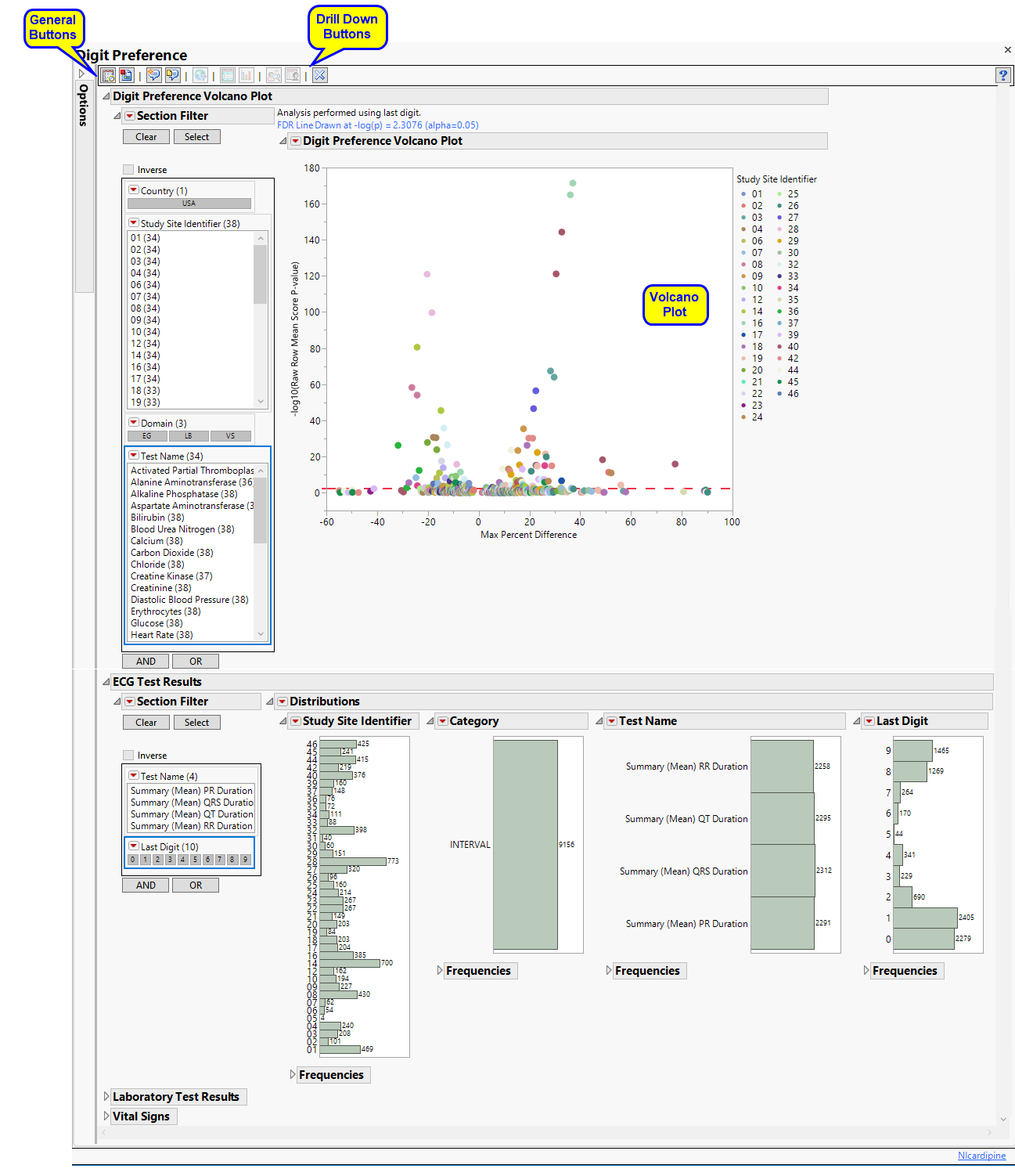 | • | In this volcano plot each point represents the comparison of a site to all other sites. This comparison is used to determine whether there is a difference in distribution for the last digit for a findings test with numeric data available and is done for all sites across all tests in all findings domains. |