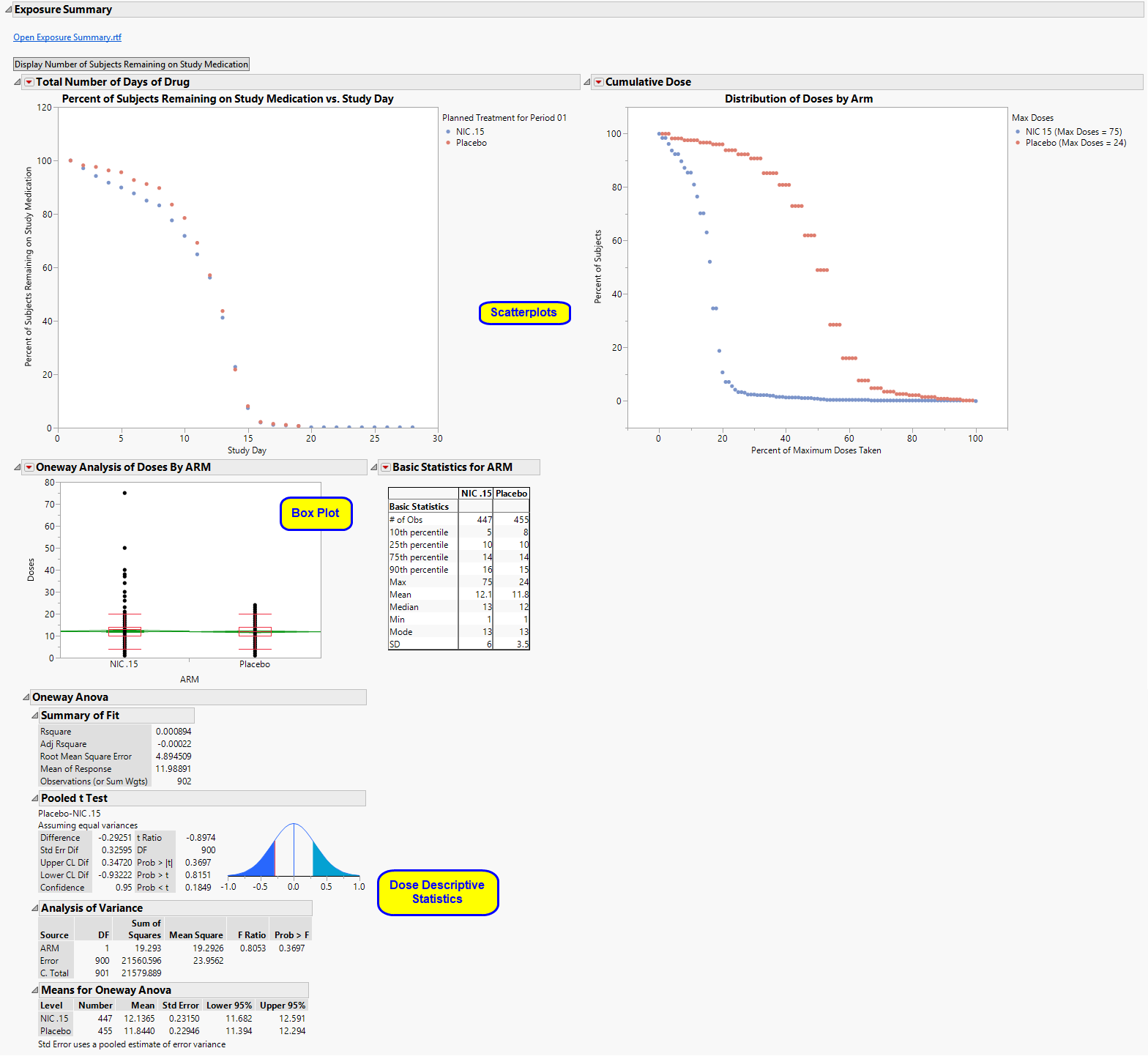 Displays three plots showing the percent of subjects who remain on the study medication by Day of Study, the distribution of doses by arm, and a list of dose descriptive statistics by ARM along with a Box Plot of doses.