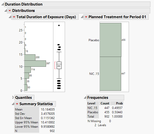 Presents a histogram for the total duration of exposure in terms of the number of days exposed to treatment. A second histogram summarizes the distribution of the treatment variable.