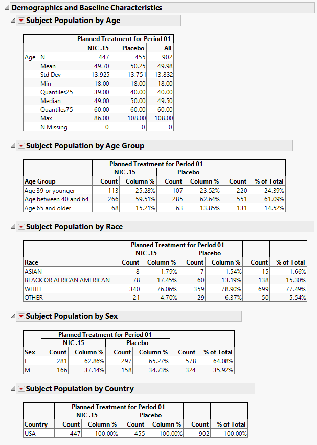 The tables in this section (shown below) summarize demographic information about the subjects in this study. Both count and percentile data are provided by treatment arm.
