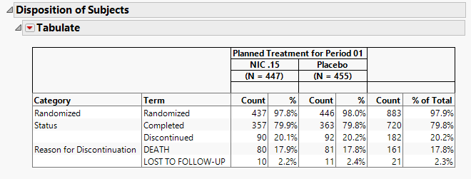 The table in this section (shown below) summarizes disposition information about the subjects in this study. Both count and percentile data are provided for each disposition event broken out by treatment arm.