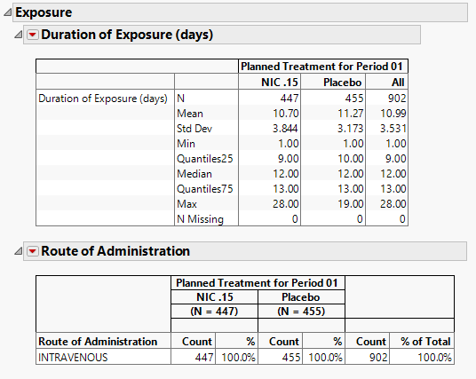 The tables in this section (shown below) summarize length of exposure by treatment arm. Treatment administration methods are also summarized.