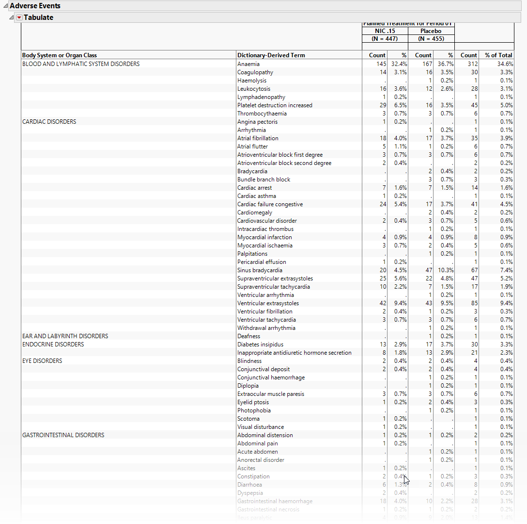 Some studies will evaluate subjects at the end of treatment and then again at the end of study. So this isn’t actually about ongoing subjects. This option takes into account whether the disposition event occurred at end of treatment or end of study and splits the table into two sections.