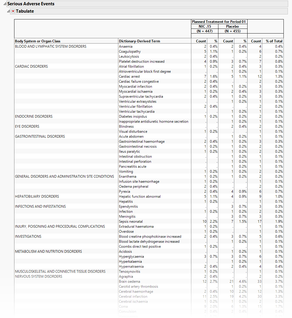 The tables in this section (shown below) summarize serious adverse events experience by subjects in this study. Both count and percentile data are provided by treatment arm.