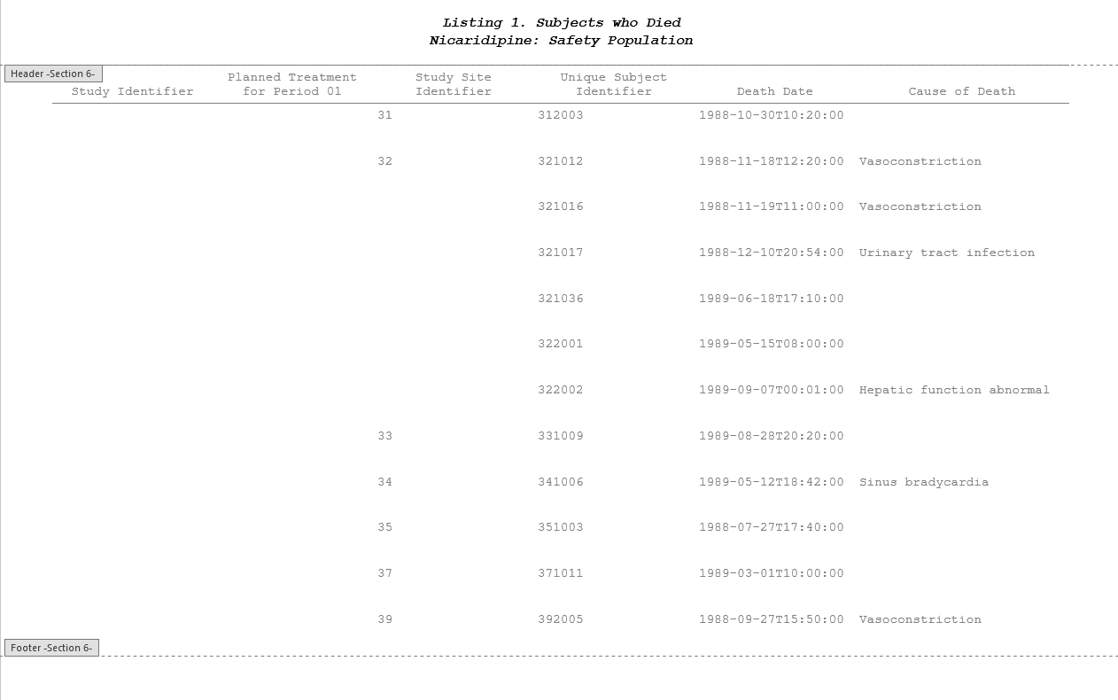 Running DSUR/PSUR Report for the Nicardipine study using default settings, generates the Report shown below.