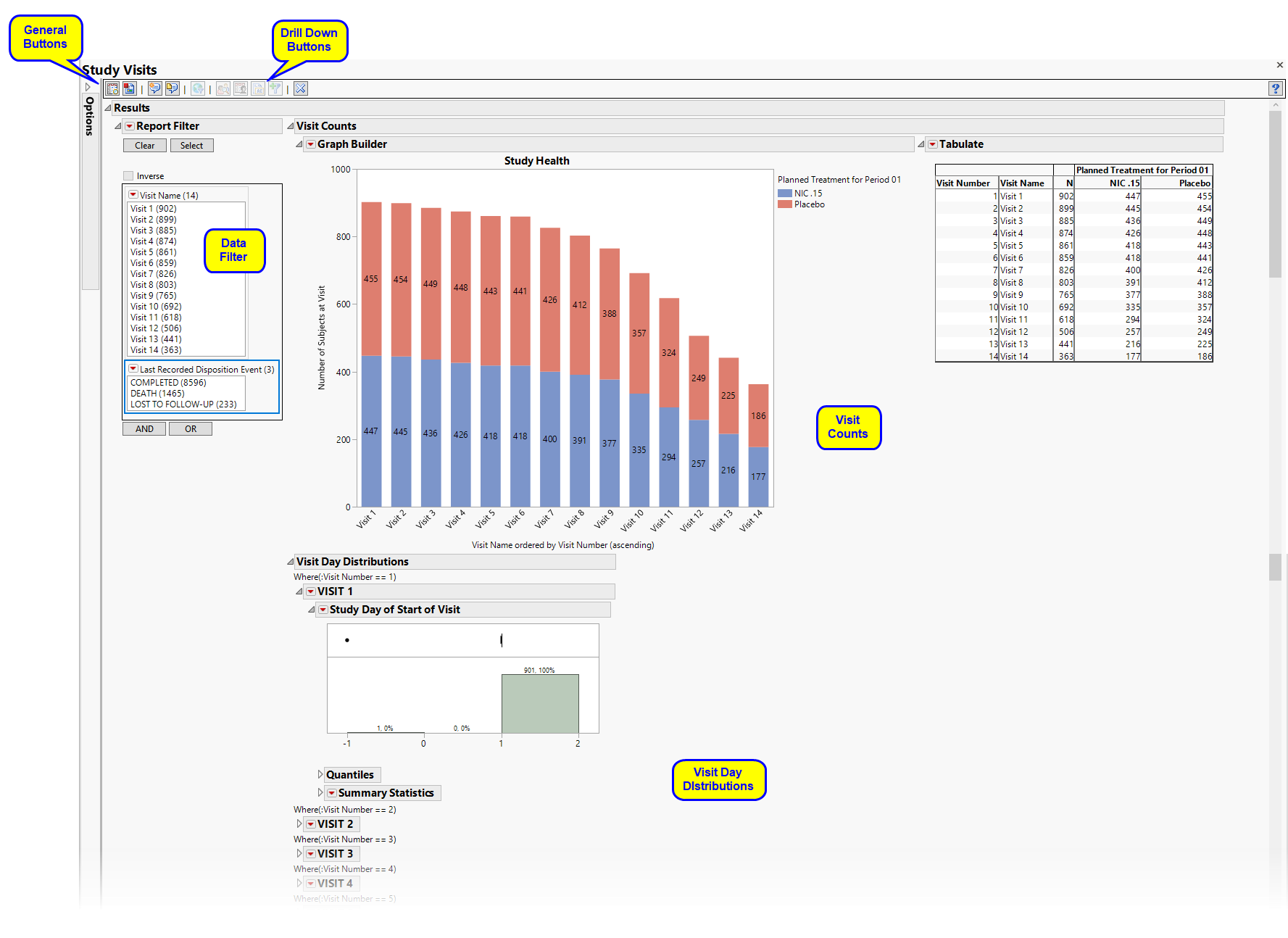 The Study Visits report generates graphical and tabulation displays of study visit attendance. Additionally, a distribution of study days for each specified visit is shown.