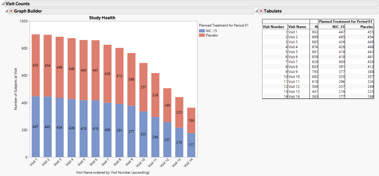 Presents a stacked Bar Chart colored by treatment and a table summarizing the number of subjects in each treatment ARM that attended each visit.
