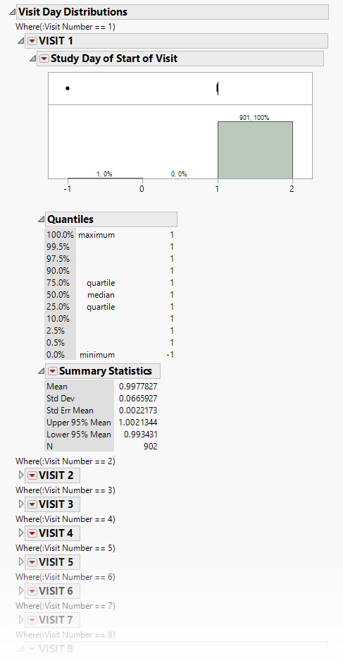 Presents a Histogram by visit of the study days on which the visits occur. Useful to identify whether subjects have gotten off schedule or if visit dates have been entered incorrectly. There is a separate distribution for each visit.