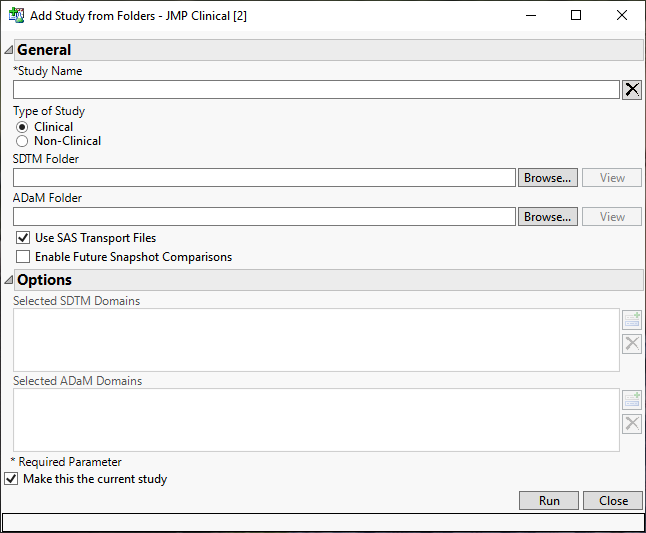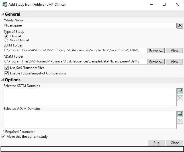 Note: When adding a clinical study and assigning both ADAM and SDTM domains, if you do not explicitly specify which SDTM and ADAM domains to include, the ADAM equivalent of each domain is added and the corresponding SDTM data set excluded. For example, if both ADAE and AE are present, then ADAE takes precedence and is included, whereas AE is not included.
