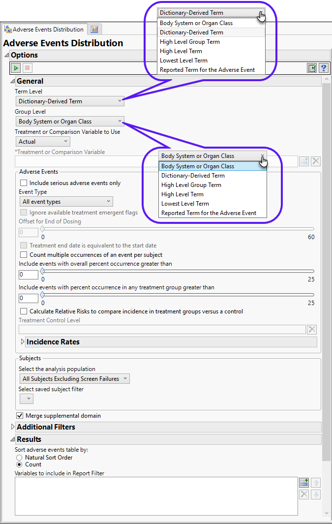The Adverse Events Distribution dialog (shown below) enables you to use the term level and group level that are available in your ae.sas7bdat data so that while AEDECOD and AEBODSYS are specified by default variables in the examples shown here, this specification can be customized based on the term levels available in the given Study.