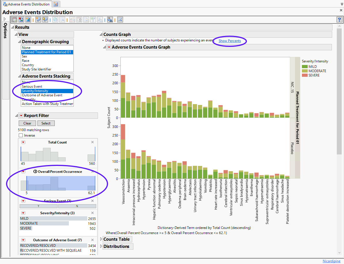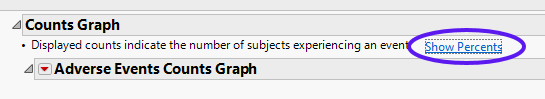 When a unique occurrence is counted only for each subject/event, the percent of subjects experiencing an event within any of the available demographic grouping variables is calculated interactively by the report. The plot below was generated by clicking Show Percents (circled above).