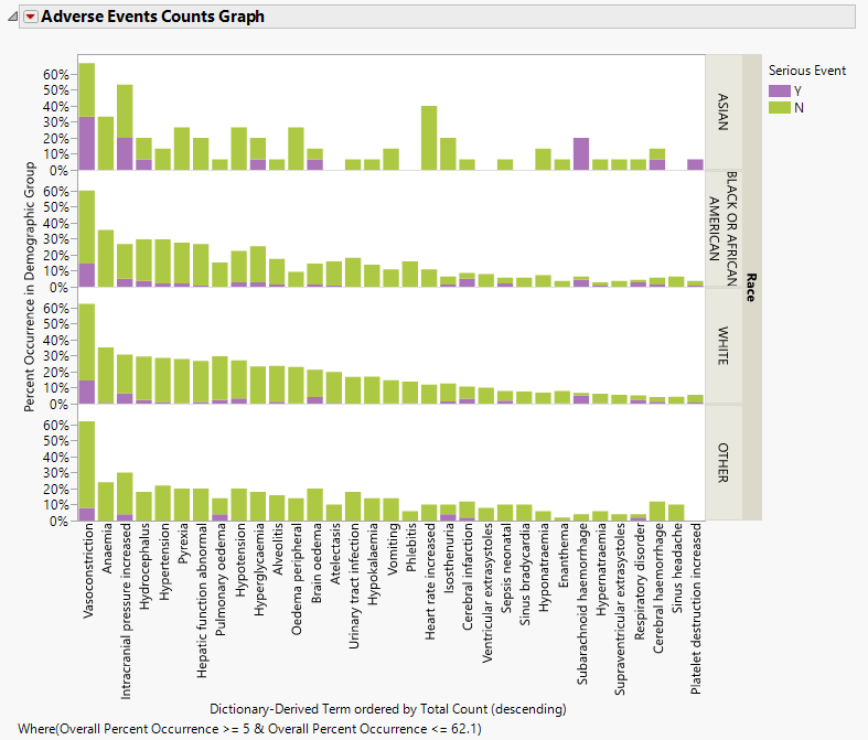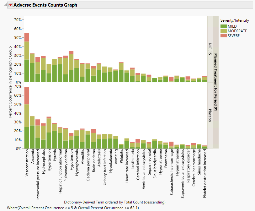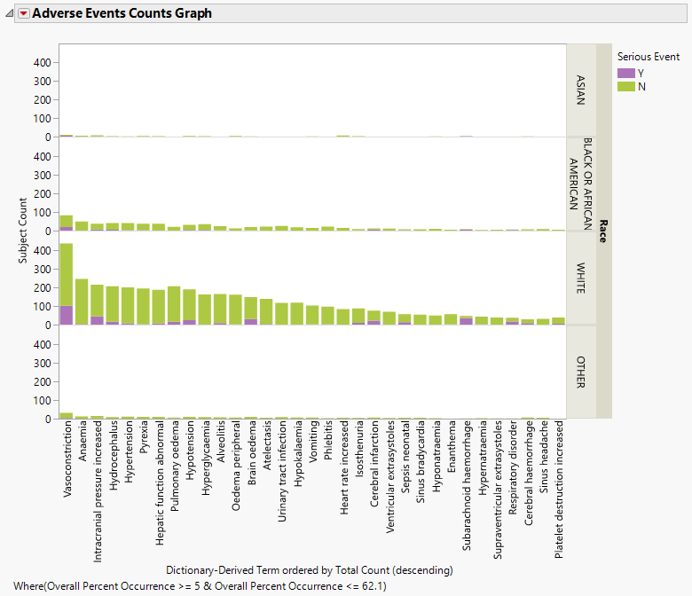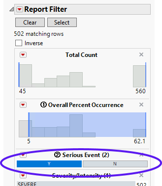 Note: JMP Clinical assumes accordance with controlled terminology: "Y" to represent severe events, and "MILD", "MODERATE", "SEVERE" to select the serious, most severe event as representative.