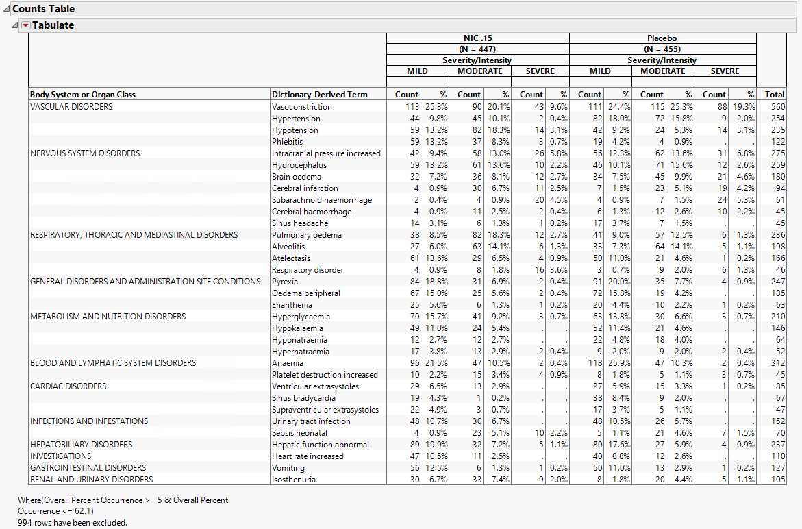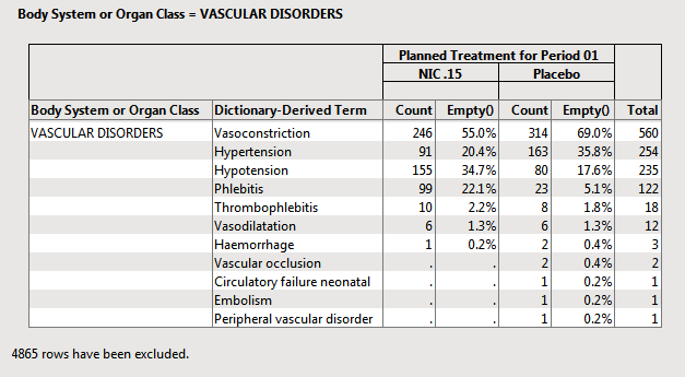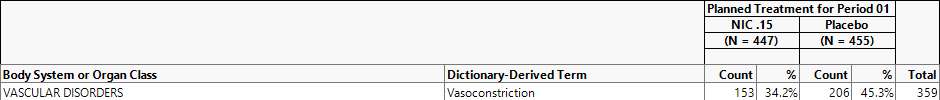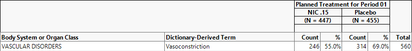 In this example, the 455 subjects on placebo make up the denominator of the percent calculation. The females showing vasoconstriction represent the subject count (or numerator) that had the event subject to any data filter specification (206 female subjects that had vasoconstriction).