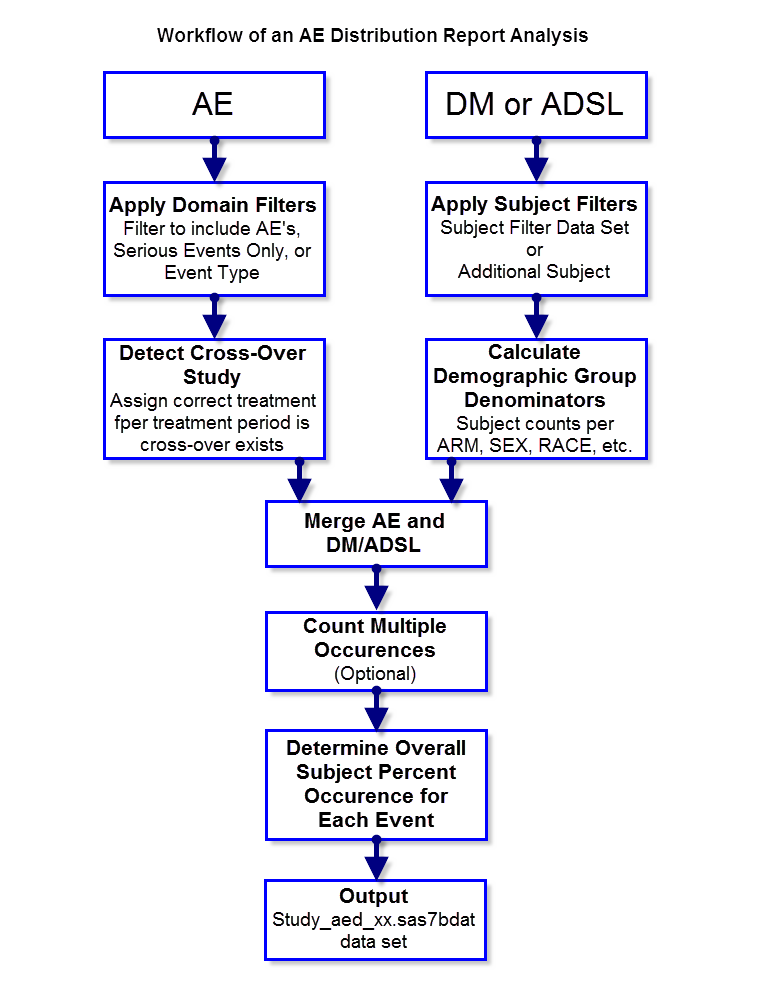 The following diagram outlines the analysis performed to summarize adverse events count and percent calculations for the Adverse Events Distribution report.