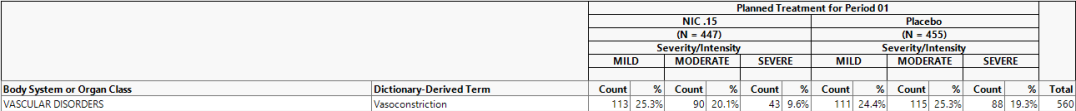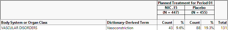113/447 = 25.3% of subjects on NIC .15 experienced MILD vasoconstriction