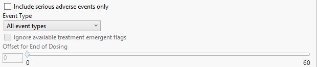 Three parameters, Include serious adverse events only, Event Type and Offset for End of Dosing, are used to specify a domain filter.