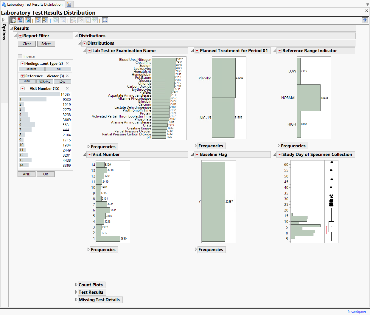 | • | Missing Test Details: Contains tables displaying subject counts for tests that were either not recorded, or that were recorded but have missing measurement values (of xxSTRESN and/or xxSTRESC). If all subjects had nonmissing recorded test measurements for all tests, this tab is not shown. |