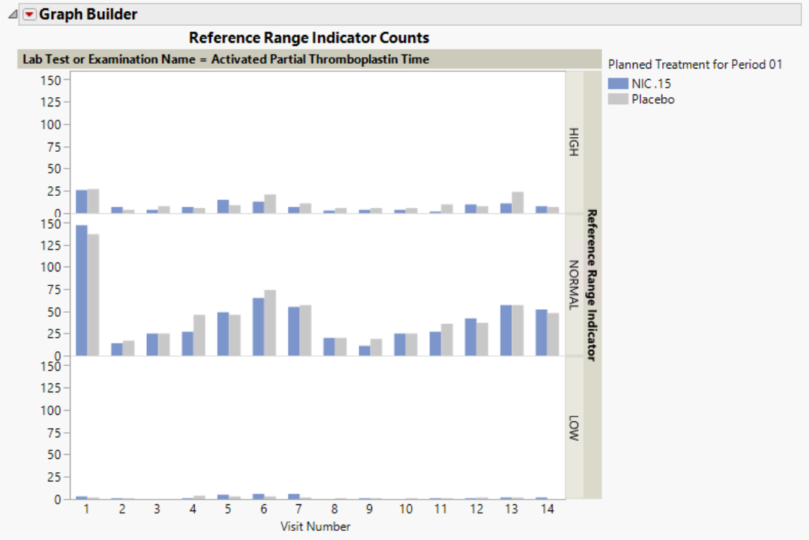 | • | Count Plots: Contains graphs for each test to display measurement counts within categories of the Reference Range Indicator variable. This tab is displayed only if the xxNRIND variable is present in the Findings domain data (typically the LB domain). |