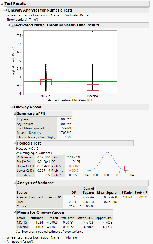| • | Test Results: Contains One-way Analyses (ANOVA) for each test that has numeric measurement results (xxSTRESN values), Contingency Analyses for each Findings test that has character results (xxSTRESC values but missing xxSTRESN values), or both. |