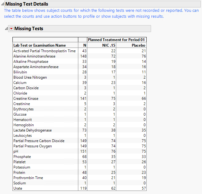 You can select the numbers in these tables and use action buttons to drill down to see profiles or lists of subjects that have missing records or missing measurement values. The Nicardipine results of counts of subjects for whom the tests were not recorded is shown.