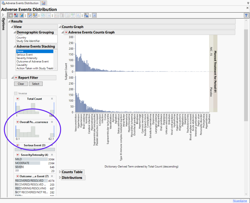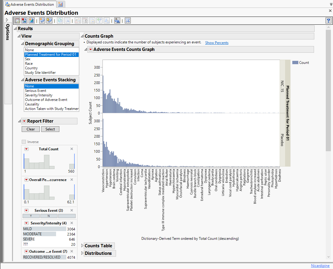 In the following example, the default (Event Type = All) Adverse Events Distribution report was run for the Nicardipine sample data and the results were subsequently filtered for Serious Event = Y, as shown below: