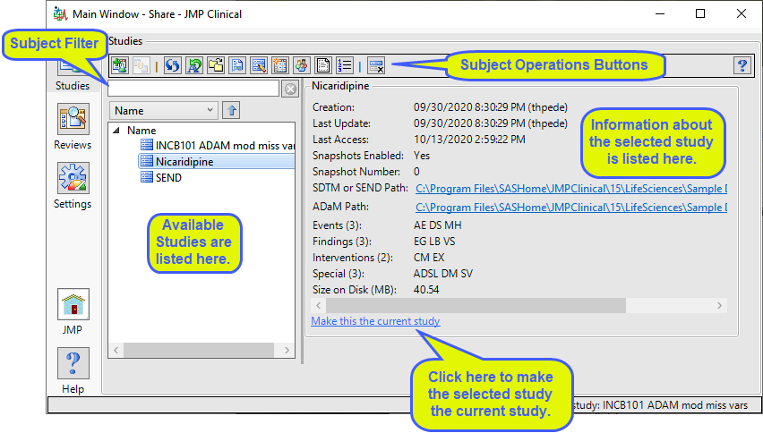 Information about the selected study is shown in the panel on the right side of the window. This includes the date the study was created, when it last updated and when it was last accessed. Additionally, the location of the study data within your file structure is shown along with a list of the domains that make up your study data. In the Nicardipine study shown above, there are 3 events domains (AE, DS, and MH), 3 findings domains (EG, LB, and VS) 2 interventions domains (CM and EX), and three special domains (ADSL, DM, and SV).