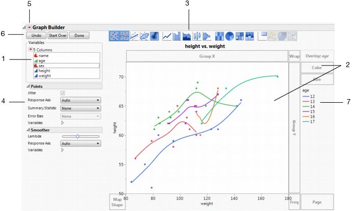 The graph in Graph Builder Window for Big Class.jmp appears. The relationship between height and weight for each value of age is shown using color in a single graph.
