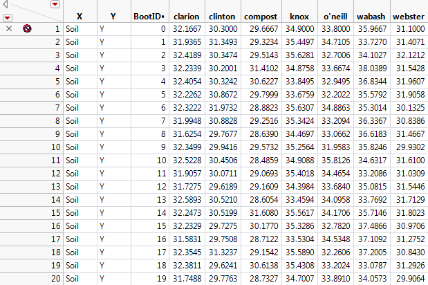 This example illustrates the benefits of the Fractional Weights (Bayesian Bootstrap) option for a small data table. The data consist of a response, Y, measured on three samples of each of seven different soil types. A scientist is interested in finding a confidence interval for the mean response for the wabash soil type.