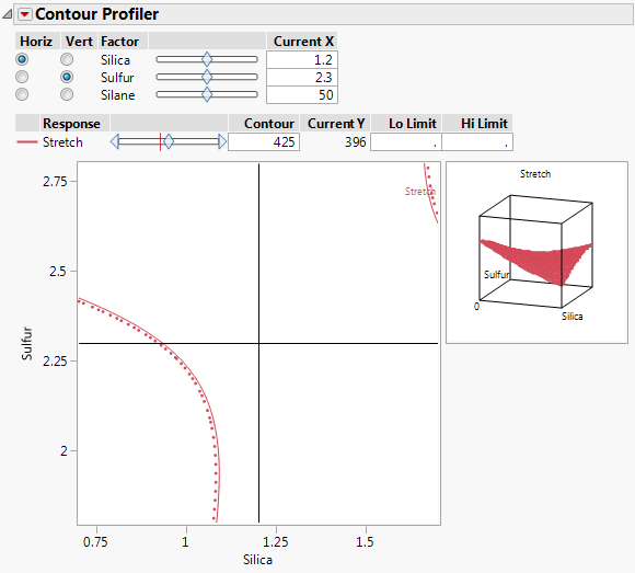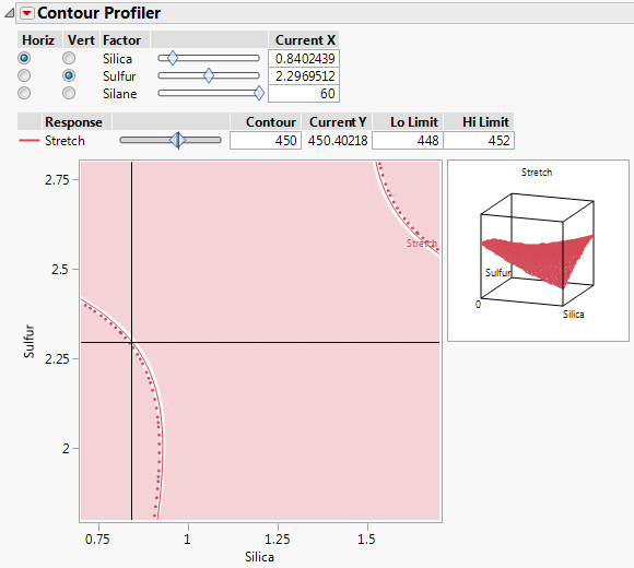 The values on the solid red curve are the Silica and Sulfur values that predict Stretch to be 450. The values within the unshaded band predict values of Stretch between 448 and 452. You can drag the crosshairs that appear on the plot to the unshaded sections to find specific settings for Silica and Sulfur. One such setting is seen in Contour Profiler for Optimal Settings.