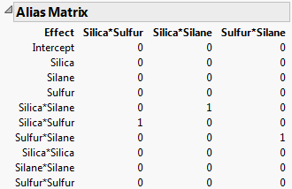 The Alias Matrix shows the Model terms in the first column defining the rows. The two-way interactions in the Alias Terms are listed across the top, defining the columns. Consider the model effect Temperature for example. If the Grind*Time interaction is the only active two-way interaction, the estimate for the coefficient of Temperature is biased by 0.333 times the true value of the Grind*Time effect. If other interactions are active, then the value in the Alias Matrix indicates the additional amount of bias incurred by the Temperature coefficient estimate.