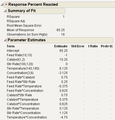 JMP can calculate parameter estimates, but because there are no degrees of freedom for error, standard errors, t-ratios, and p-values are all missing. Rather than use Fit Model, you can use the Fit Two Level Screening platform, which specializes in getting the most information out of these situations, leading to a better model. The report from the Fit Two Level Screening platform for the same data is shown in Half Reactor.jmp Fit Two Level Screening Design Report.