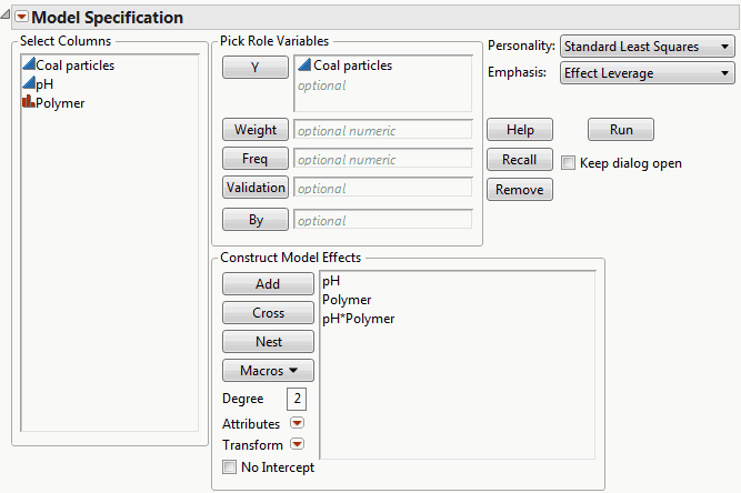 When you click Run, the Fit Least Squares report appears. The Effect Tests report indicates that the interaction between pH and Polymer is significant and should be included in the model.