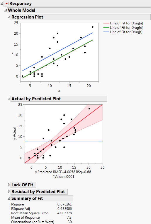 The Regression Plot in the report shows that you have fit a model with equal slopes (Analysis of Covariance for Drug Data). Compared to the main effects model (Drug effect only), RSquare increases from 22.8% to 67.6%. The Root Mean Square Error decreases from 6.07 to 4.0. As shown in Analysis of Covariance for Drug Data, the F-test significance probability for the whole model decreases from 0.03 to less than 0.0001.