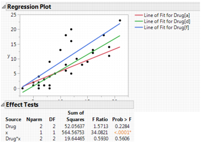 Continuing with the Drug.jmp sample data table, this example fits a model where the slope for the covariate depends on the level of Drug.