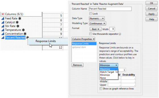 In the Column Info dialog that appears, change the response limit to Maximize, as shown on the right in Change the Response Limits Column Property for the Percent Reacted Column.