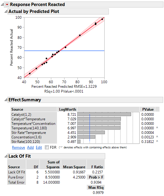 The Actual by Predicted Plot indicates that the overall model is significant (P < 0.0001). Both the Actual by Predicted Plot and the Lack of Fit Test show no evidence of model misspecification. The Effect Summary report shows that Catalyst is the most significant effect. However, note that the three two-factor interactions are also significant.