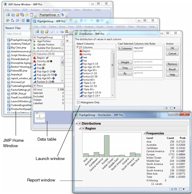 JMP consists of platforms that are organized by the type of statistical analysis. For example, the Distribution platform produces a univariate analysis using histograms, additional graphs, and reports. You might analyze data in the Distribution platform and then choose another platform to examine the data more thoroughly. As a result, several windows are open at once: at a minimum, the data table, platform launch windows, and the results of the analyses.