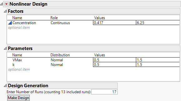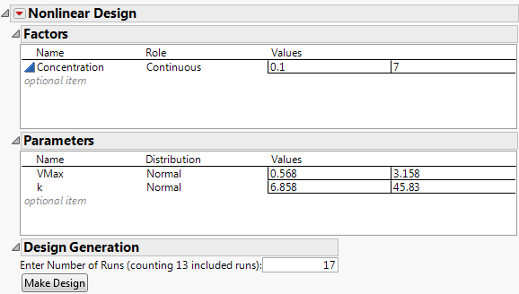 In the Chemical Kinetics.jmp data, the values for Concentration range from 0.417 to 6.25. Therefore, these values initially appear as the low and high values in the Factors outline. You want to change these values to encompass a broader interval.